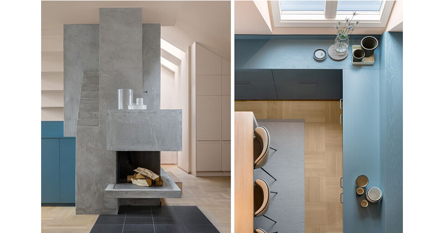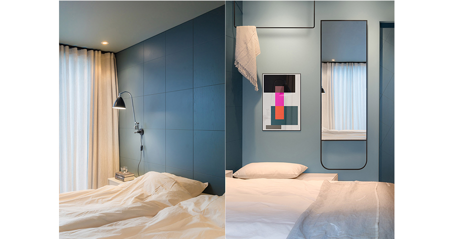 以蓝灰色为基底的空间墙面,打造一个内敛不失温馨的日常休息场所。