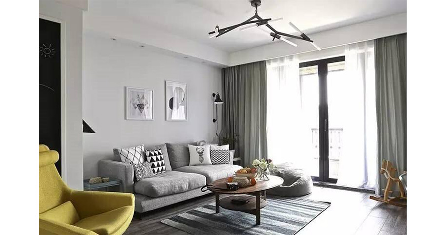 Tips:窗帘的颜色与家具、墙体统一,让空间显得和谐。在安装时,落地窗帘稍稍接触地面最合适。
