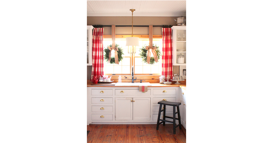 巧妙利用帘杆悬挂圣诞花环,利用与窗帘图案相呼应的布带做衔接的纽带,通过蝴蝶结的巧思点缀,即使没有过多的装饰物,也能通过红白格窗帘与花环的结合彰显浓郁的圣诞氛围。