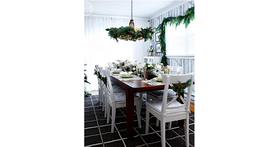 将绿植编织而成的花环悬挂在窗帘之外,利用窗幔的弧度延伸出圣诞花环,营造出宛若一体的和谐感,不仅呼应了户内摆置的大型圣诞树,还体现了空间对称的美感。